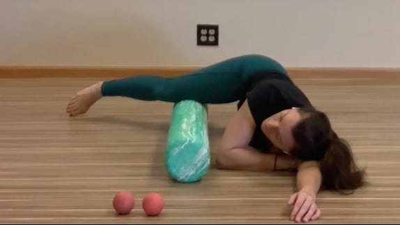 This class just feels really good. Two tennis balls dig into the lower back and all the way up through the spinal muscles, good massage with the roller in the glutes, thighs, chest and shoulders, delicious stretches throughout and we end on the jaw and head. Yum.